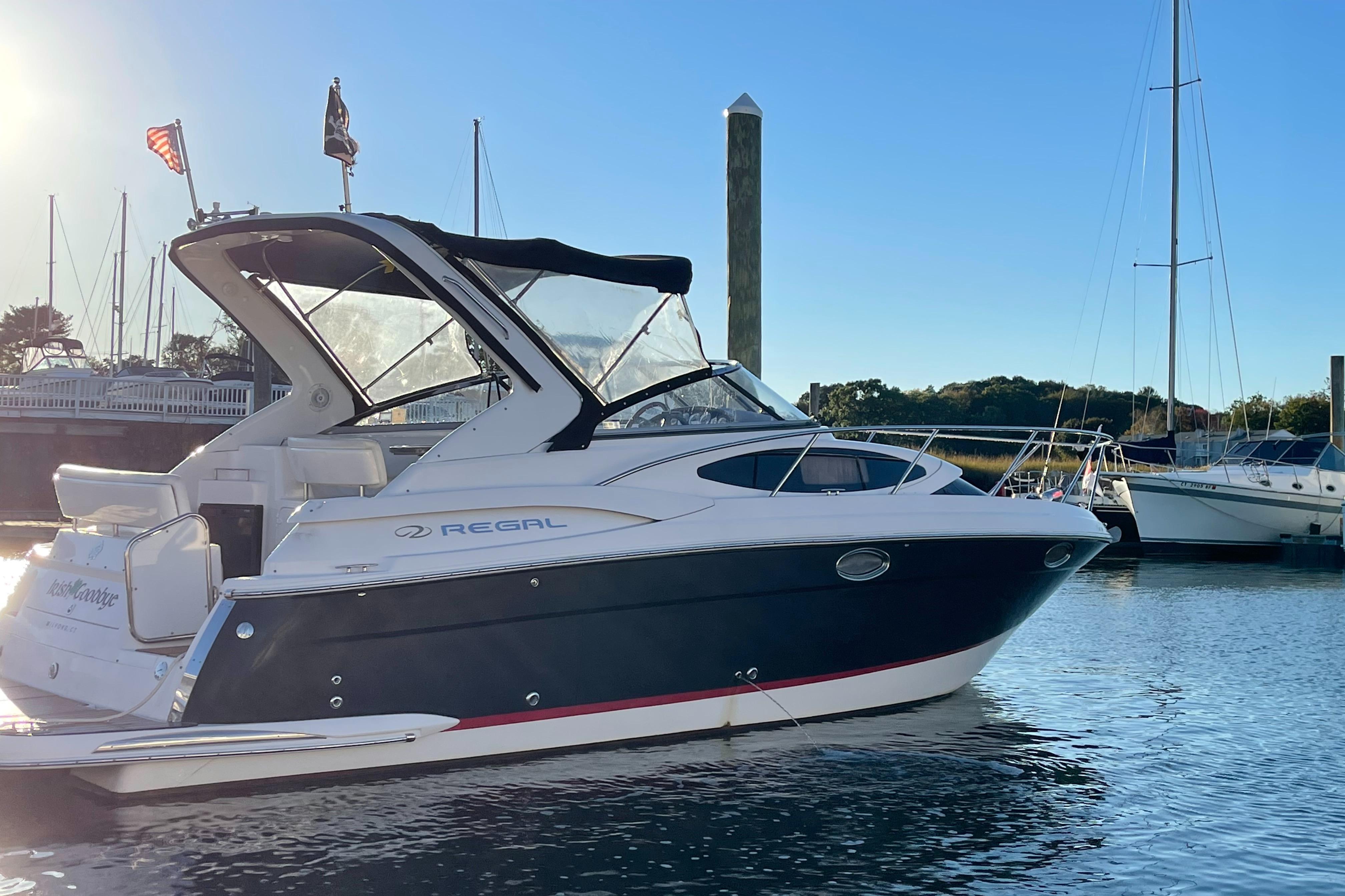 A refined explorer. Wherever your desired destination, reach it in ultimate comfort and confidence with the Regal 28 Express. Along the journey, relax and enjoy the ride thanks to the thoughtful cockpit layout and expansive cabin space down below. Rich in amenities polished with elegance, the 28 Express is equipped for an excursion you’ve only dreamed about "Don't Ask" is a Trailerable Express Cruiser that affords flexibility especially considering rising slip and storage costs. Powered by a Volvo Penta 5.7 300HP I/O that cruises in the low 20 knot range but has the power to get you back in the 30-knot range if need be. The fit and finish is exceptional with high gloss cherry interior cabinetry, double helm seat, stainless steel drink holders, cockpit cooler, transom shower, trim tabs, extended swim platform and a retractable spot arch.